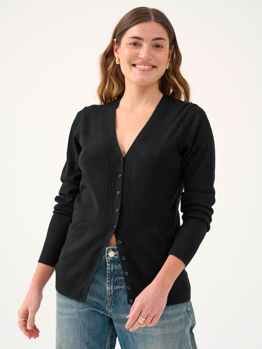 Saquito con botones y bolsillos. Detalle de tejido en trenzas.