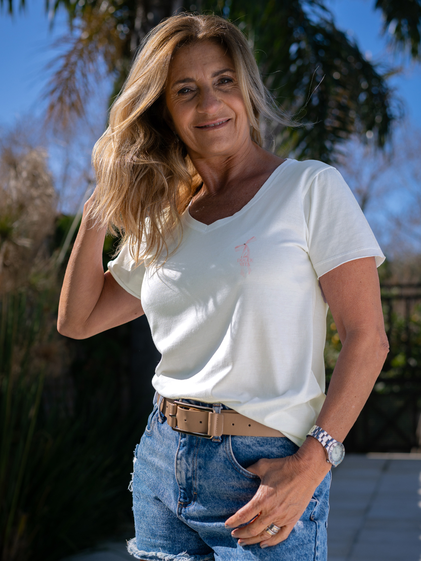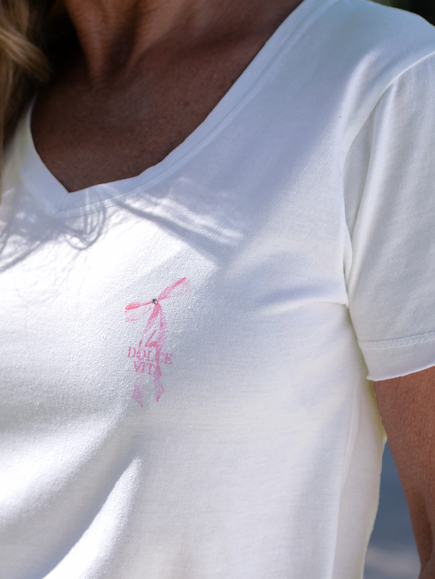Remera manga corta con escote en «V» y sublimado de moño en delantera.