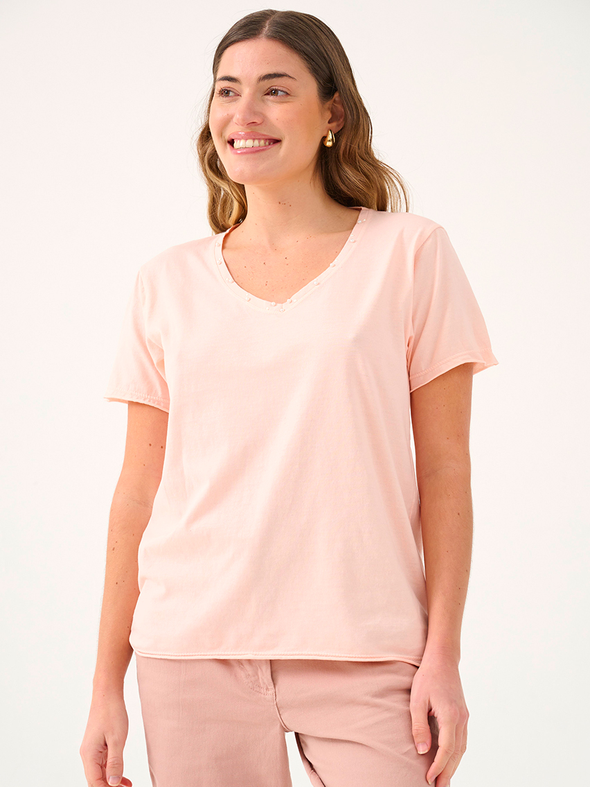Remera clásica con «escote en V «, perlas y media perlas en escote.