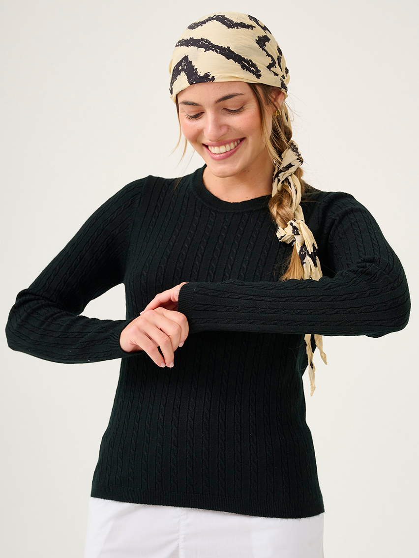Sweater cuello redondo, tejido con trenzas y canelones.