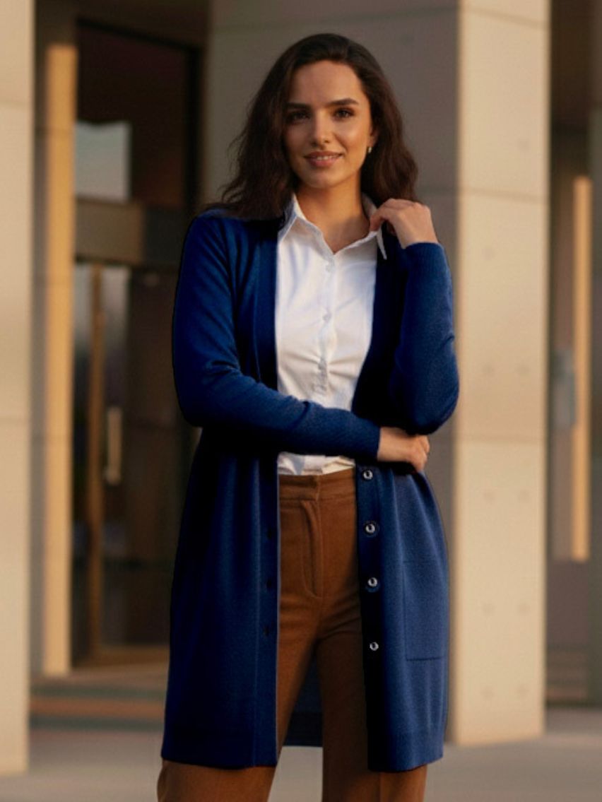 Saquito largo, con bolsillos. Detalle de tajos en los laterales.