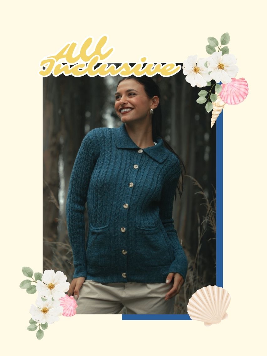 Cárdigan con punto fantasía, bolsillos en delantera y cuello chomba.