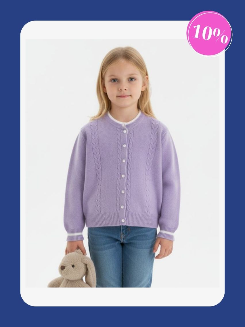 Cárdigan con vivo en cuello y puños combinados. Delantera con trenzas y ochos.