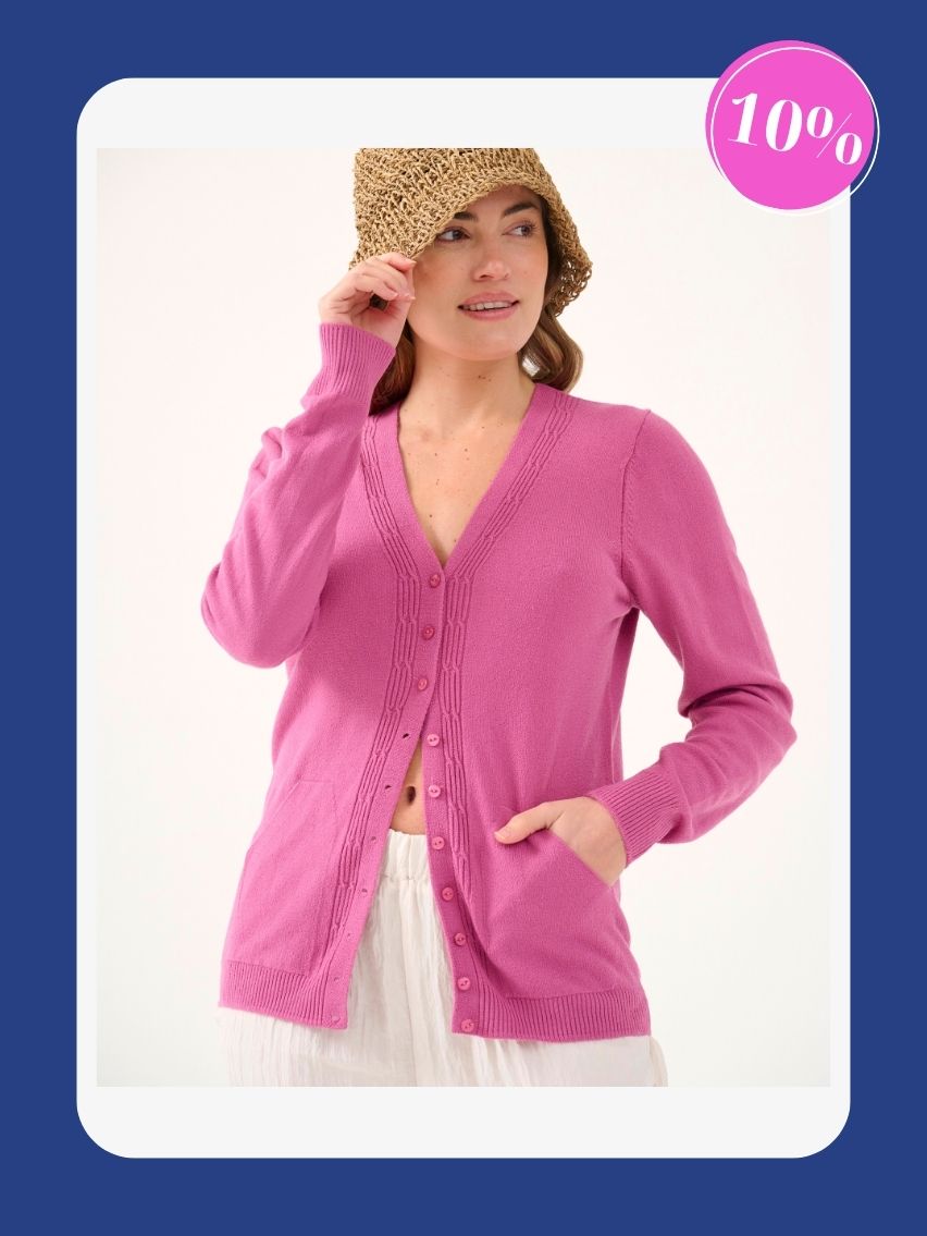 Saquito con botones y bolsillos. Detalle de tejido en trenzas.