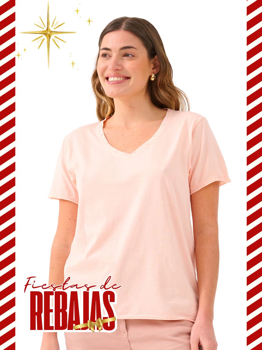 Remera clásica con «escote en V «, perlas y media perlas en escote.