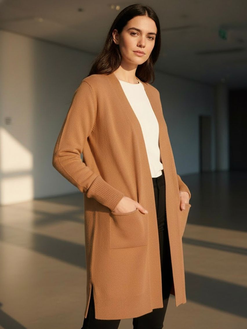 Saco largo abierto con bolsillos y tajos laterales. Detalle de puño doblado.