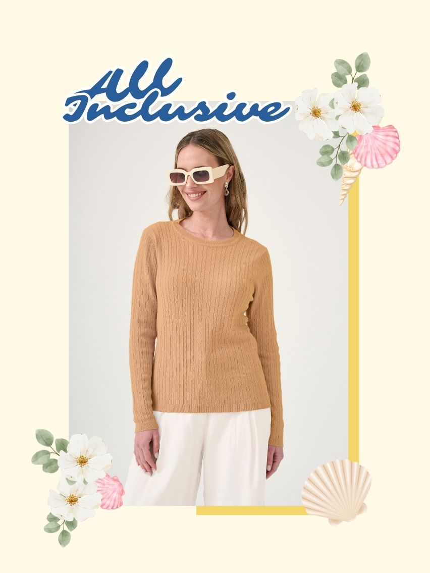 Sweater cuello redondo, tejido con trenzas y canelones.