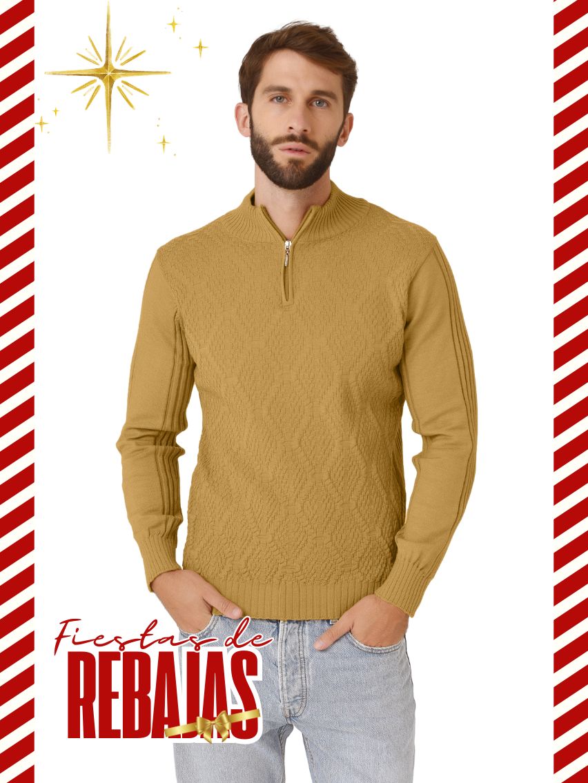 Sweater con cierre en cuello, rombo en delantera y canelones en espalda y mangas.